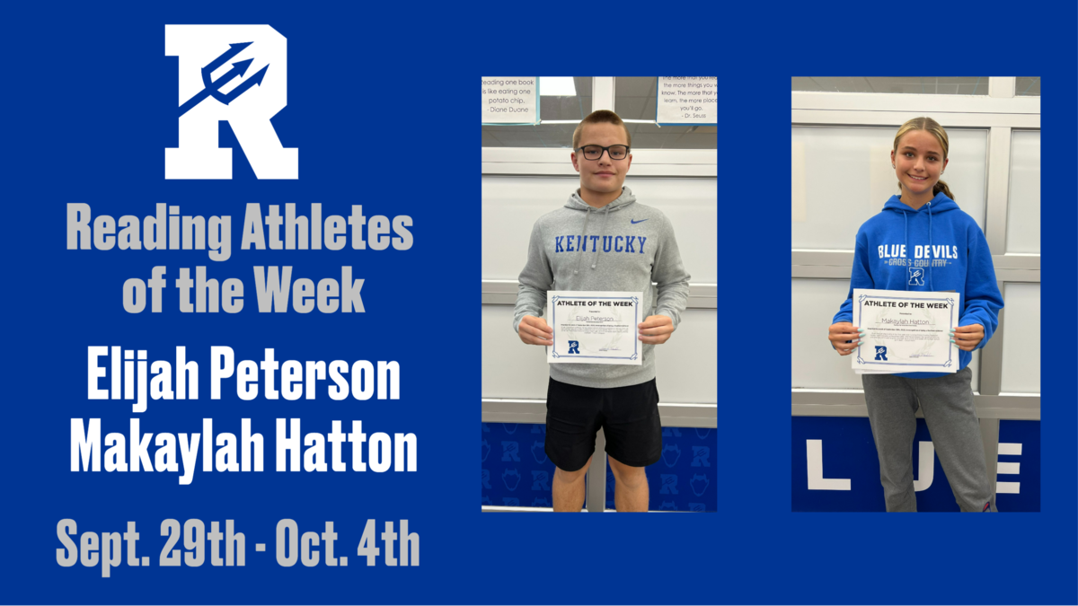 Congratulations to our Reading Athletes of the Week: Varsity Boys Soccer player Elijah Peterson, and Varsity Girls Cross Country runner Makaylah Hatton!
