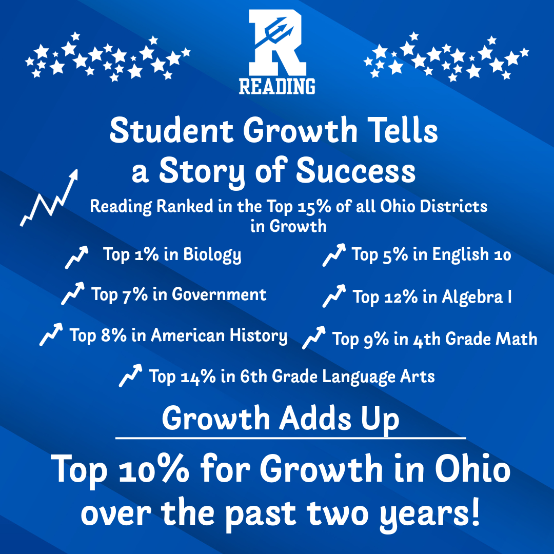 When combining both school years, Reading Schools ranks 58th out of 607 districts, placing the district in the top 10% statewide for overall growth. Few districts in Ohio, particularly those of similar size and demographics, have achieved such consistent improvement.