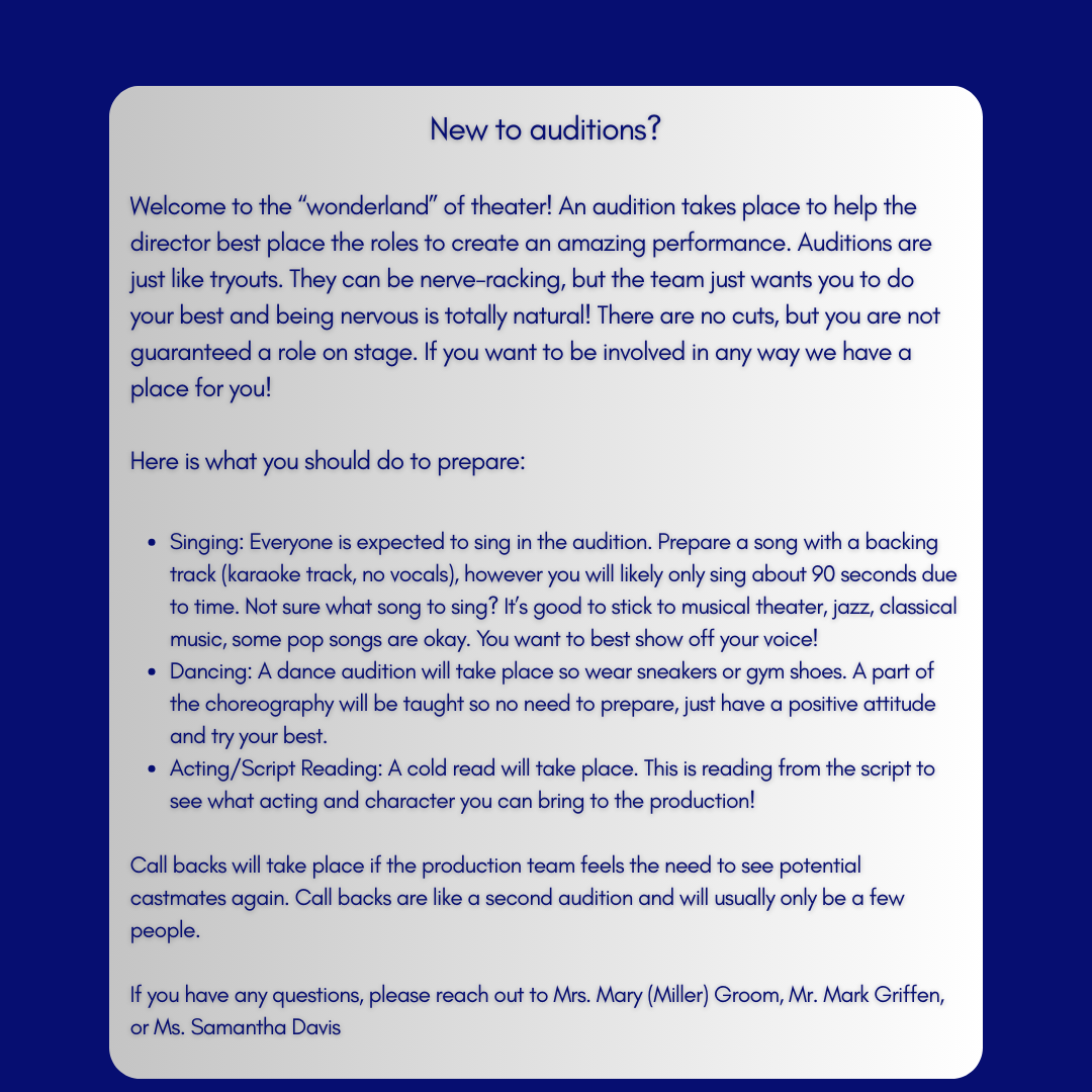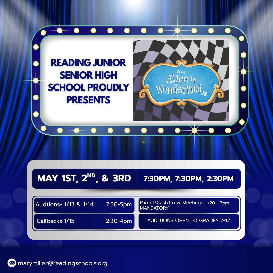 Reading Junior/Senior High School proudly announces auditions for its first full-length theater production in the new building. Auditions will be held on January 13 and January 14, with the performance scheduled for May.